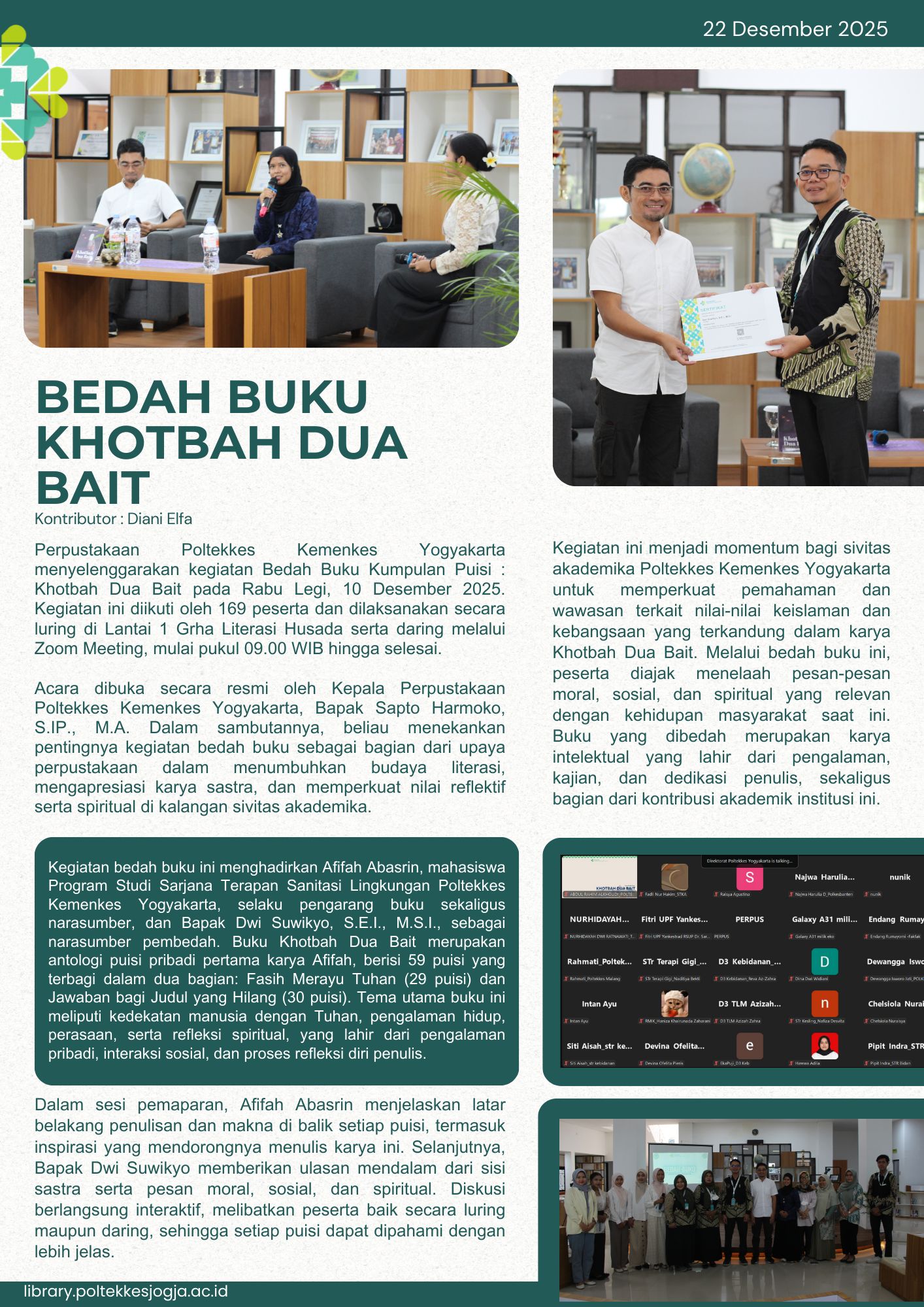 library.poltekkesjogja.ac.id – Yogyakarta, Senin Legi (11/12/2023) melalui Unit Perpustakaan Poltekkes Kemenkes Yogyakarta telah terselenggara kegiatan bedah buku secara luring dan daring dengan buku berjudul “Menyiapkan Soft Skill Bagi Lulusan Mahasiswa Kesehatan”. Acara ini dihadiri oleh Civitas Akademika POLKESYO serta menghadirkan Bapak Dwi Suwiknyo, S.E.I., M.S.I dari Pesantren Penulis, sebagai narasumber serta penulis buku “Menyiapkan Soft Skill Bagi Lulusan Mahasiswa Kesehatan” yakni Ns. Maryana, S.Si.T., S.Psi., S.Kep., M.Kep, Dr. Agus Wijanarka, S.Si.T., M.Kes., Ibu Eko Suryani, S.Pd., S.Kep., M.A., Dr. Iswanto, S.Pd., M.Kes., dan Ibu Herni Endah Widyawati, S.Tr.Gz yang diwakilkan oleh Ns. Maryana, S.Si.T., S.Psi., S.Kep., M.Kep. Tujuan diadakan acara Bedah Buku ini adalah civitas akademika polkesyo dapat memahami khasanah pengetahuan, memahami isi dari buku “Menyiapkan Soft Skill Bagi Lulusan Mahasiswa Kesehatan” dan menerapkan ilmu-ilmu yang didapatkan dari buku tersebut serta diharapkan pula menambah semangat civitas akademika polkesyo untuk menerbitkan buku.